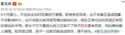 但是那天宝爸在客厅突然说话,吓得宝宝一个激灵,棉棒也在宝宝的耳朵里重重地划了一下。当下宝宝一直大哭,耳朵里也有血。虽然带去看医生后,医生说并没有大问题,只要消炎就好了。但是,就因为这个事,下次再也不敢用棉棒给宝宝清洁耳朵了。